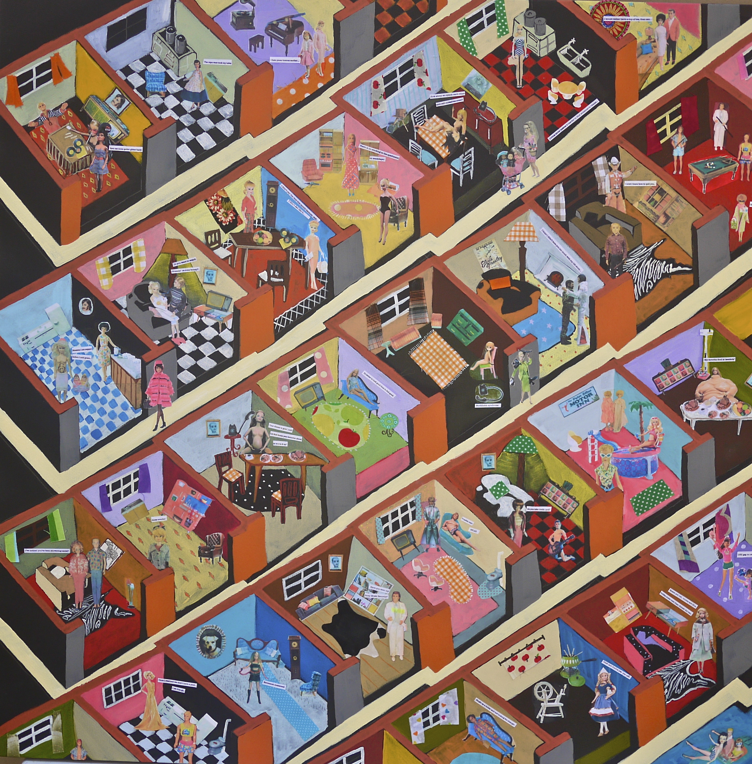Yes, Ticky Tacky came about after exploring these urban/suburban map scenarios, and I suddenly thought, what would happen if I lifted the roof off of all those little houses and exposed the people within them? I chose Barbie and Ken to represent us in more true-to-life roles that are not seen within the Mattel design room – representing gay marriage, single parenting, drug & alcohol addiction, sex workers, obesity, menopause and independent single minded individuals who just chose to live alone without the spinster/bachelor label.