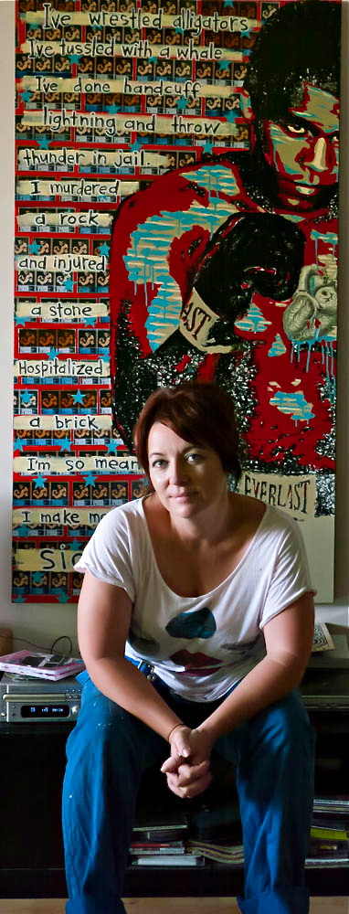 One artist I couldn’t keep my peepers off was Kelly Sullivan. She has an eye for the iconic, for colour and finding an ordered placement for nonsense. She takes the individual – snippets, scenarios, words, pictures – from her mind and suburban surroundings and makes them connect. Besides the finger smearing artist in America, the General Hospital actress and the nun from the Nicaraguan orphanage, I found the real Kelly Sullivan, Australian mixed media artist hiding in her Byron Bay bunker. I am very fortunate that Kelly has found some time to put down the scissors and chat about her art.