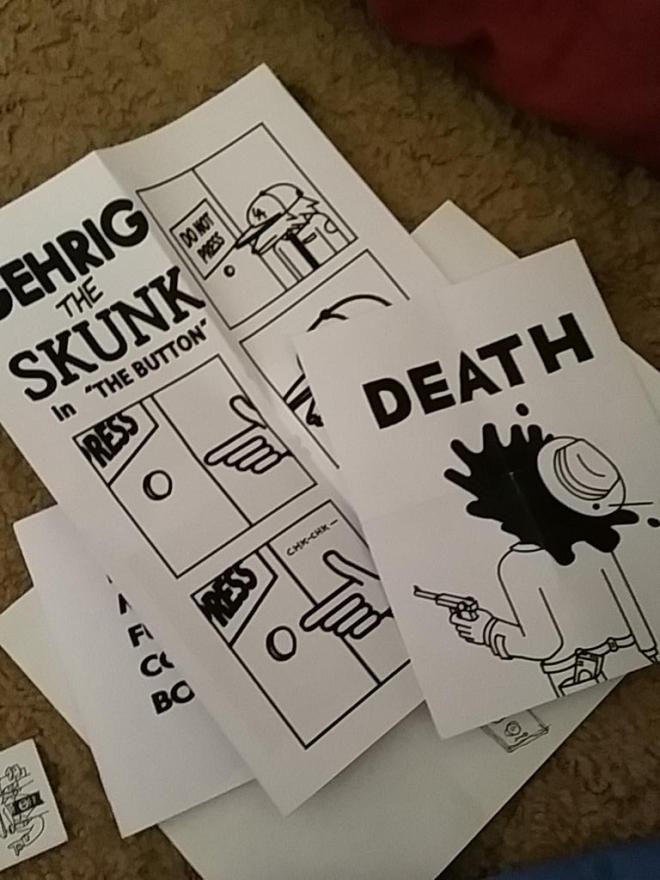 The first story inside this DEATH is dark, bordering psychotic, alarm bells ring a sort of Silence Of The Lambs starring Steinbecks Lennie, then it busts with image, nothing correlates but it fits. Death Zine is gorgeous, his BADASS MOTHER FUCKING COLOURING BOOK soothes. Hope I am invited to his funeral.