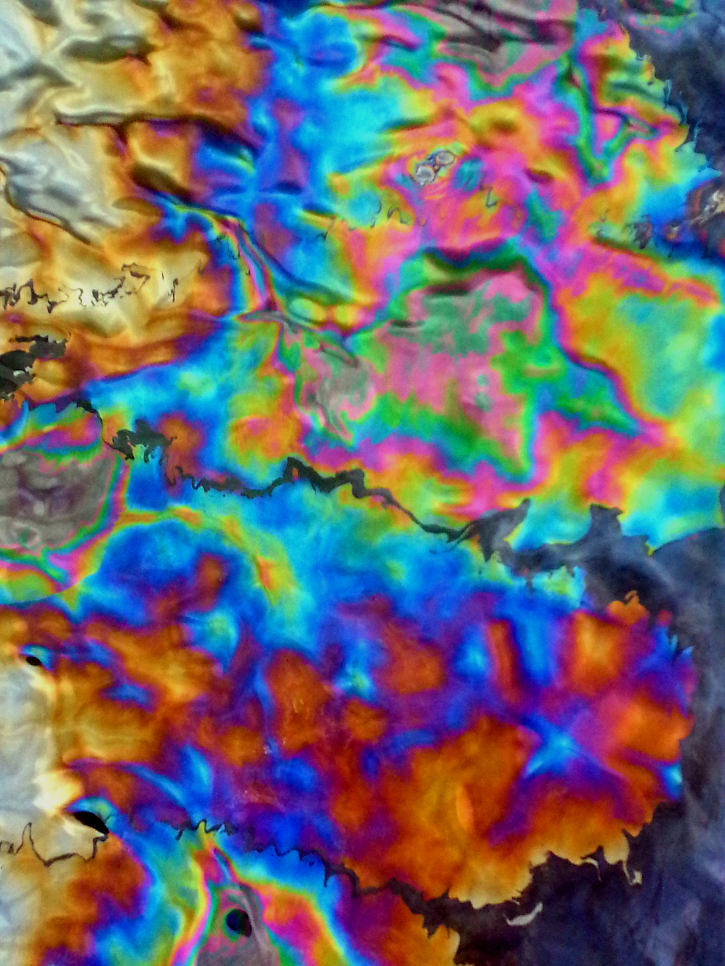 oil slickWhen you walk on the memorial itself, a silence takes over and you stare up at the black embossed names of those lost and interned in the ships grave. Over the edge the oil still seeps after seventy or more years, it’s old life’s blood forming an amazing colour spectrum on the surface of the water. Looking at the rusted bones itself nature has taken over. A new beautiful reef of coral, weed and fish shimmy distracting and easing the pain and enormous weight of grief of the Dec 7 1941 attack.
